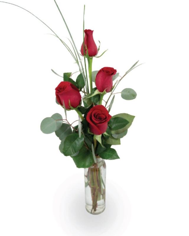 Four premium roses artfully displayed in a classic budvase, highlighting the natural beauty and elegance of the bloom. Accented with light, complimentary greenery, this simple yet refined arrangement offers a timeless expression of thoughtfulness and charm. Perfect for desks, tables or intimate gestures, it delivers a graceful touch of beauty in a compact design.