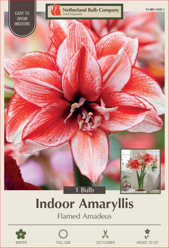 Amaryllis 'Flamed Amadeus' reaches 18 to 24 inches tall, featuring 6 to 8 inch double-petaled blooms in fiery red with white brushed petals and a deep red throat. Each jumbo-sized bulb (36/+) produces two to three thick stalks, with four giant flowers per stem, blooming 8 to 12 weeks after planting.