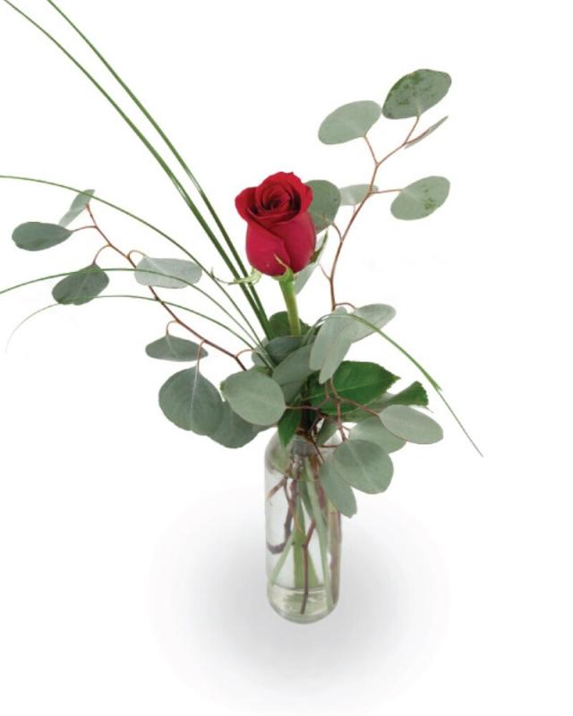 A single, premium rose artfully displayed in a classic budvase, highlighting the natural beauty and elegance of the bloom. Accented with light, complimentary greenery, this simple yet refined arrangement offers a timeless expression of thoughtfulness and charm. Perfect for desks, tables or intimate gestures, it delivers a graceful touch of beauty in a compact design.
