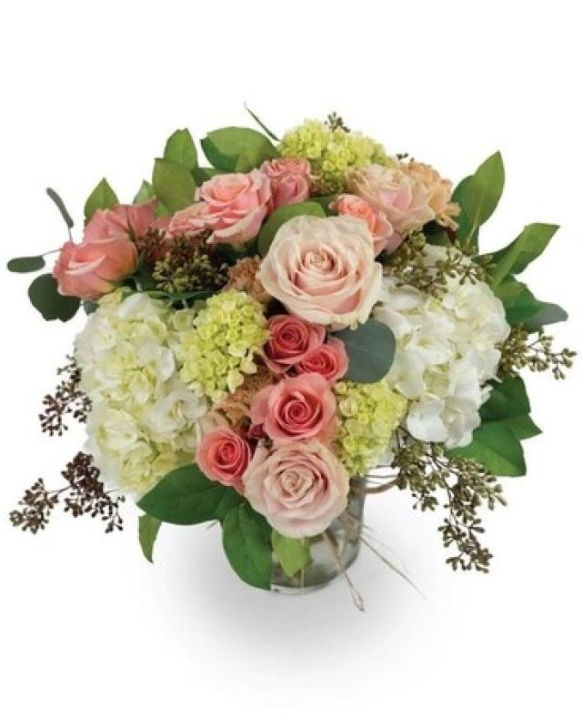 Full and beautifully layered arrangement is generously full and offers a striking presentation. Featuring soft pink roses and spray roses accented with fresh green mini hydrangeas and classic white hydrangea, the design offers a perfect balance of romance and freshness. Artfully arranged to create volume and movement, this lush composition makes and elegant statement for celebrations, heartfelt occasions, or sophisticated home decor.