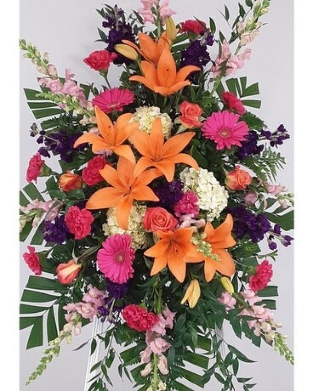 Bold and bright fragrant blooms of orange, purple and pink accented with traditional foliage. Photos shown of the deluxe size. Designed with lilies, gerbera daisies, roses, hydrangea carnations and stock on a wooden easel stand.