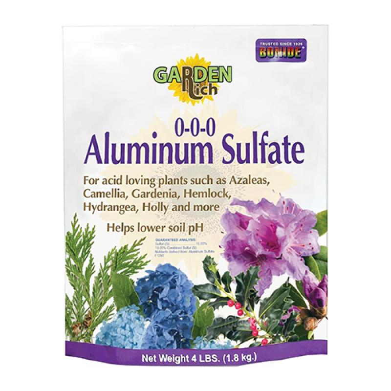 Aluminum Sulfate is designed to lower soil pH for acid-loving plants such as Azaleas, Camellia, Gardenia, Hemlock, Holly, & more. It helps to turn Hydrangeas blue also.