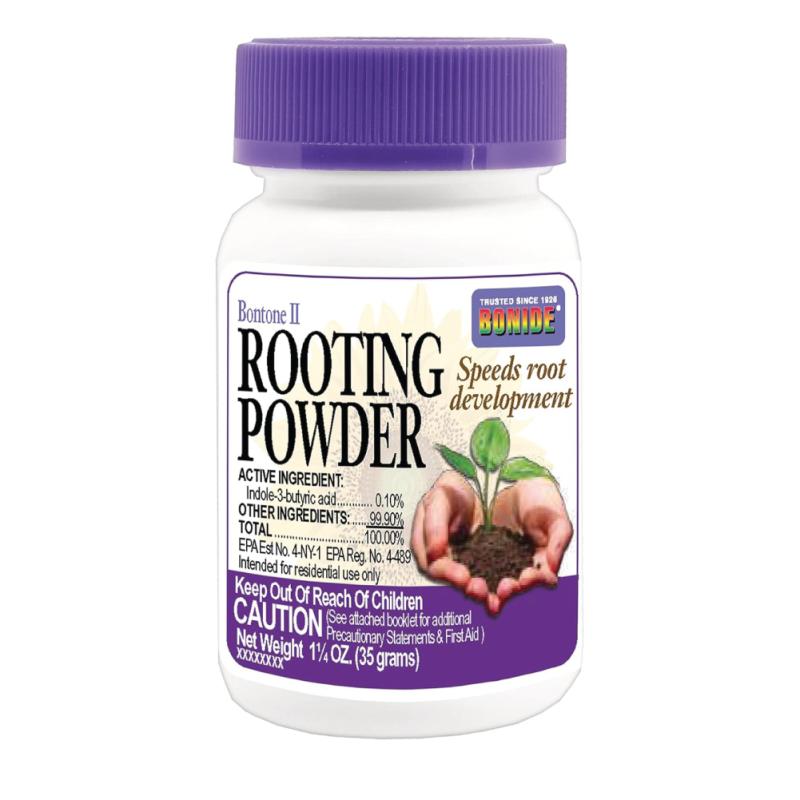 Bontone rooting powder from Bonide promotes quick root development from cuttings once applied; to apply, simply dip the end of a clipping into the powder and then place it in moist soil to help the rooting process of cuttings