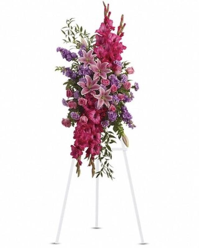 Express admiration for their beauty and spirit with a striking tribute certain to evoke many cherished remembrances. Gorgeous flowers such as pink roses, oriental lilies and gladioli blend with purple stock, lavender carnations and fragrant greens.