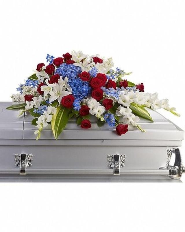 A beautifully patriotic way to pay tribute to a loved one. This half-couch spray sends an eloquent message of strength, respect and freedom. Brilliant flowers such as blue hydrangea, red roses, white oriental lilies and much more create this dignified way to honor the deceased.