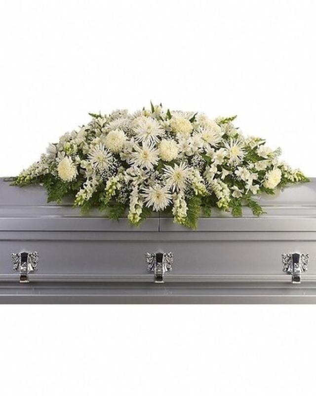 The purity of this all-white casket spray creates an aura of serenity and peace - a beautifully memorable final farewell to a lost loved one. The elegant arrangement includes white alstroemeria, white snapdragons, white chrysanthemums, white spider chrysanthemums and million star gypsophila, accented with assorted greenery.