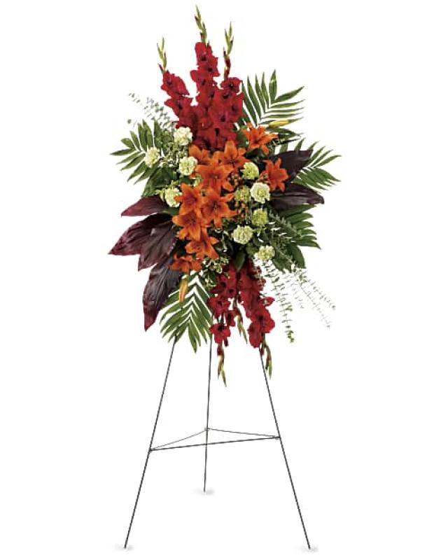 While the loved one is no longer present, there are happy times that will never be forgotten. This radiant spray of red and orange flowers will be a lovely reminder.