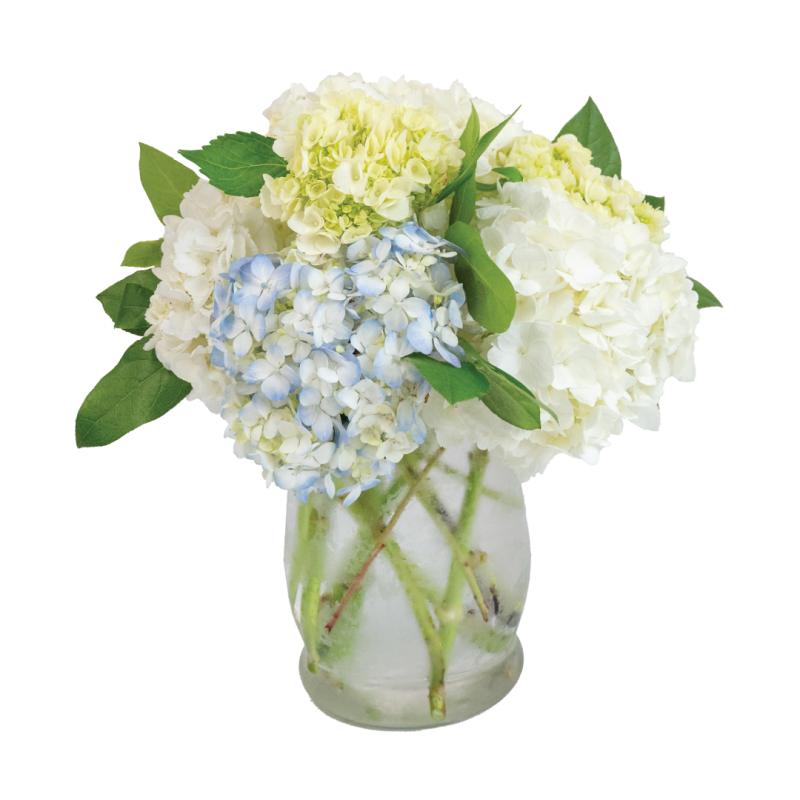 A soft and elegant blend of seasonal blooms, this arrangement features lush white hydrangeas paired with delicate hints of pale blue, creating a fresh and calming color palette. Accented with vibrant green foliage and thoughtfully arranged in a clear glass vase with visible stems for a natural, airy look, this design brings effortless beauty to any space. Perfect for celebrations, sympathy, or everyday décor, it offers a timeless expression of grace and serenity.