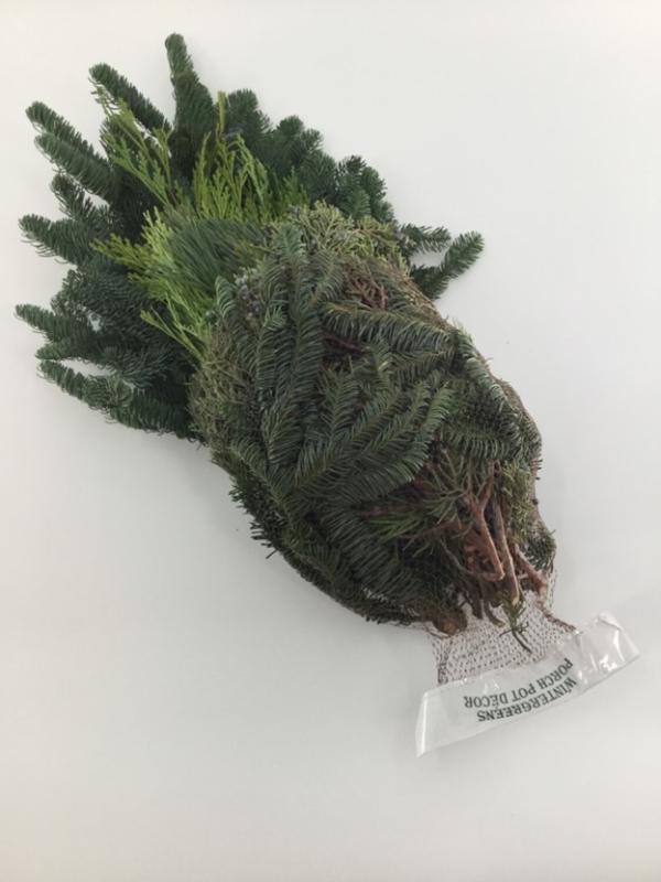 Each kit contains 2 of each 24" branches of Noble Fir (Thriller), Juniper and Pine (Filler), and Cedar (Spiller). Each kit will make up one residential-sized porch pot (approximately 8"-12" diameter pot).