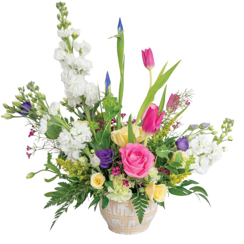 This statement arrangement has classic spring blooms bursting in every direction! Featuring fragrant white stock, classic pink roses, iris, purple lisianthus, wax flower and butter yellow spray roses, this floral masterpiece is sure to make a lasting impact.