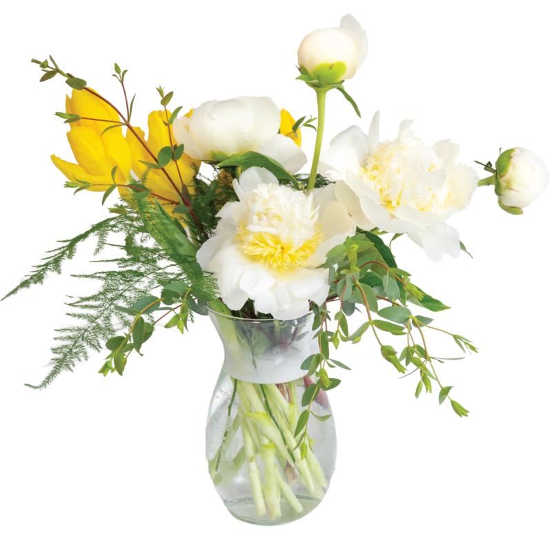 Soft, joyful, and effortlessly elegant, Playful Peonies captures the lighthearted beauty of the season. Lush, cloud-like peonies take center stage, paired with cheerful yellow tulips that bring a gentle pop of sunshine. Airy accents of plumosa and the silvery-green movement of gunni eucalyptus add texture and a fresh garden feel, all thoughtfully arranged in a tall vase for an elevated silhouette.