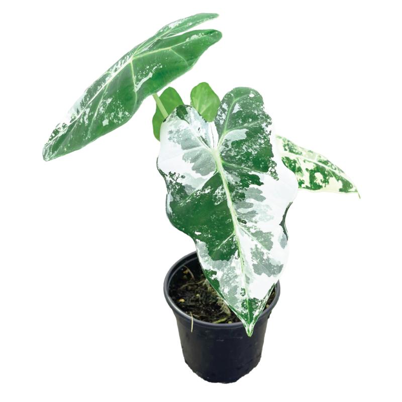 Sometimes known as an Elephant's Ear plant (referring to the outdoor varieties). This tropical plant, native to regions of Asia or Australia, needs warm and humid conditions to thrive as a house plant. The alocasia likes extremely well draining soil to prevent rot but needs to be kept evenly moist. A houseplant mix with additional orchid bark or perlite is helpful. There are many different types of alocasia including the popular "african mask" plant or "Polly", the Frydek, black velvet, and more.