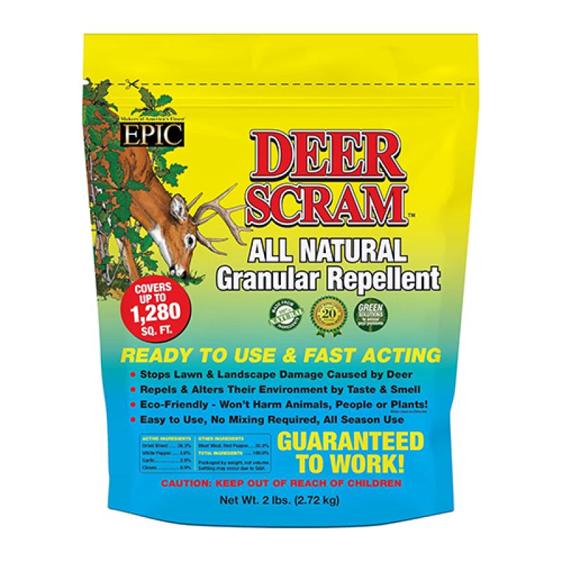 EASY TO APPLY - This repellent can be applied by spreader or by hand sprinkle. When applying the granule, apply 18” from the edge of the plants & be heavy enough so as to visibly cover the ground around the plants and shrubs to be protected. It is important to treat Deer Scram as a perimeter barrier around the desired area you want protected.
