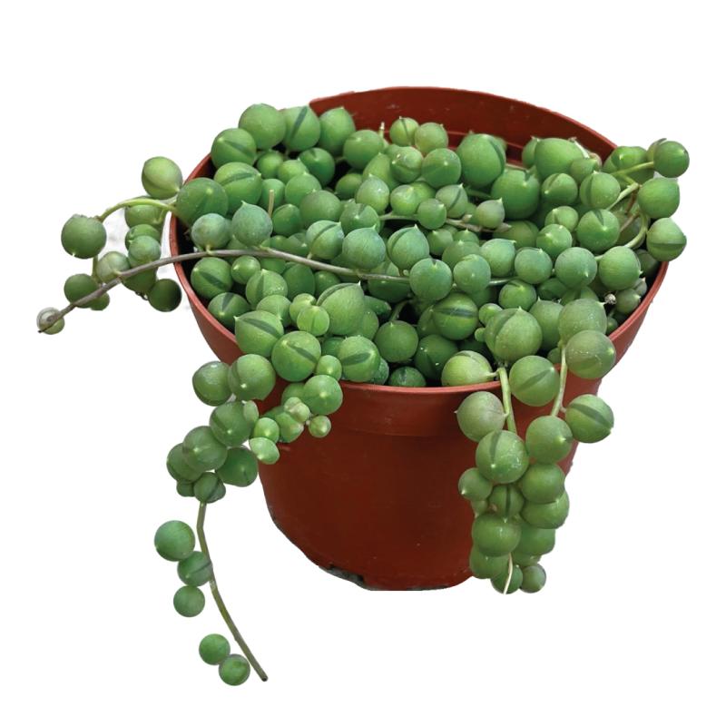 The string of pearls is a well-known and popular houseplant, with pearl-shaped "leaves", this succulent trails over the sides of its pot. Putting this plant in a hanging basket or pot is a great way to display the string of pearls, but make sure the top of the plant is receiving adequate light, or else the pearls will dry off and look sparce. They like a very loose potting mix with lots of sand and perlite, like a cactus mix and to be watered when completely dry. Err on the side of under watering, this plant is extremely susceptible to rot. The pearls will shrivel up as a sign that it needs to be watered.