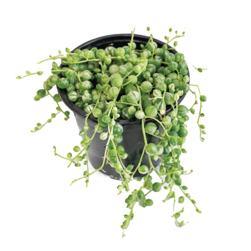 The string of pearls is a well-known and popular houseplant, with pearl-shaped "leaves", this succulent trails over the sides of its pot. Putting this plant in a hanging basket or pot is a great way to display the string of pearls, but make sure the top of the plant is receiving adequate light, or else the pearls will dry off and look sparce. They like a very loose potting mix with lots of sand and perlite, like a cactus mix and to be watered when completely dry. Err on the side of under watering, this plant is extremely susceptible to rot. The pearls will shrivel up as a sign that it needs to be watered.