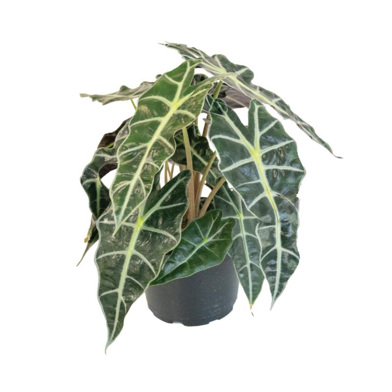 Sometimes known as an Elephant's Ear plant (referring to the outdoor varieties). This tropical plant, native to regions of Asia or Australia, needs warm and humid conditions to thrive as a house plant. The alocasia likes extremely well draining soil to prevent rot but needs to be kept evenly moist. A houseplant mix with additional orchid bark or perlite is helpful. There are many different types of alocasia including the popular "african mask" plant or "Polly", the Frydek, black velvet, and more.