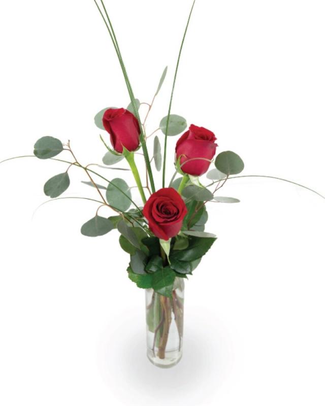 A petite arrangement perfect for special occasions or everyday! Designed with single stem roses and a sprig or two of mixed foliage in a slender clear glass vase