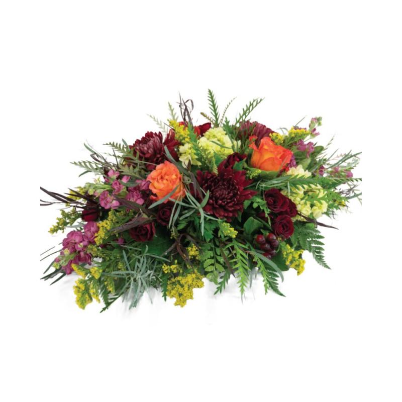 A long and low design filled with roses, fuji mums, hydrangea, solidago, stock and mix of greenery. Sure to be the focal point on any dinner table.