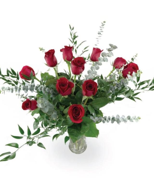 A premium arrangement of one dozen long-stem roses, featuring taller exceptionally full blooms chosen for their superior quality and striking presence. Each rose is complimented by elevated, refined foliage that adds depth, texture and a luxurious finish to the design. Thoughtfully arranged to highlight height and balance, this upscale bouquet offers a dramatic, elegant silhouette and is ideal for making a lasting impression on the most special occasions. *Presented in a 10 1/2"" Romanesque glass vase and measuring approximately 28"" tall*