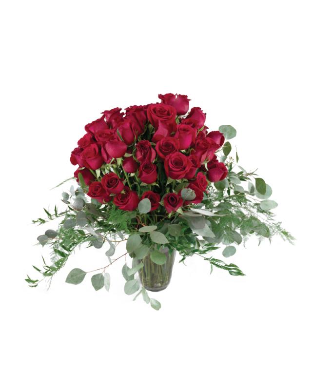 A premium arrangement of three dozen long-stem roses, featuring taller exceptionally full blooms chosen for their superior quality and striking presence. Each rose is complimented by elevated, refined foliage that adds depth, texture and a luxurious finish to the design. Thoughtfully arranged to highlight height and balance, this upscale bouquet offers a dramatic, elegant silhouette and is ideal for making a lasting impression on the most special occasions. *Presented in a 10 1/2"" Romanesque glass vase and measuring approximately 28"" tall*