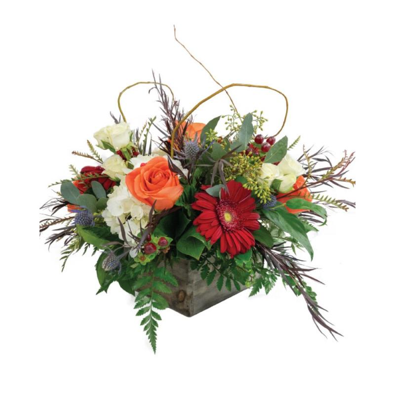 Hydrangea, spray roses, ranunculus, and safari sunset highlighted by amaryllis and mixed with hypericum berries, maple, olive branch, gravallia, erynguim, and branches in an oblong wooden box. A beautiful transitional arrangement, perfect for your holiday table.