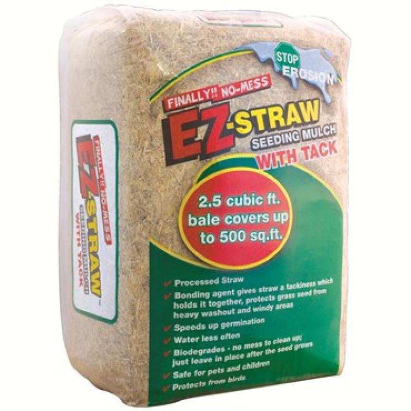 EZ STRAW MULCH W TACK 2.5 BALE Processed straw with bonding agent gives straw a tackiness which holds it together, protecting grass seed from heavy washout and windy areas. Speeds up germination, protects seed from birds and holds moisture. Biodegrades and helps enrich topsoil.Twice cut and processed for easy application. Safe for pets and children. 2.5 cu ft bale covers up to 500 sq ft.