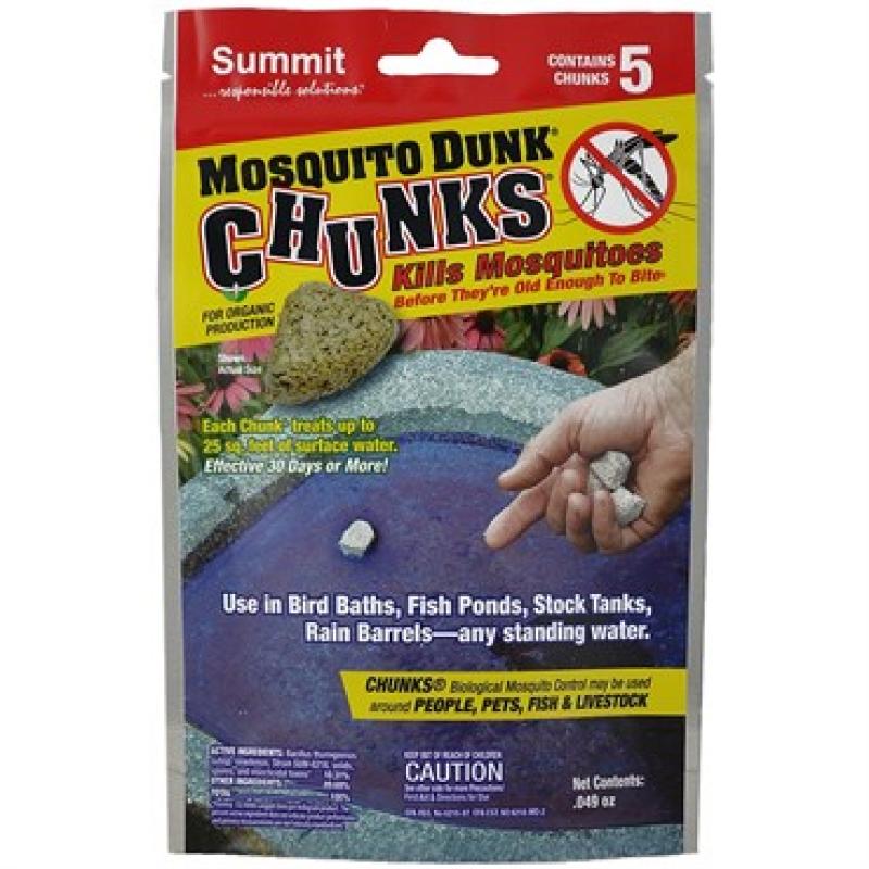 Kill mosquito larvae in any standing water with a convenient toss of a Chunk®. Perfect for birdbaths, rain barrels, sprinkler valve boxes, and other small areas that hold water. Each Chunk® covers up to 25sq ft and works for 30 days or longer.