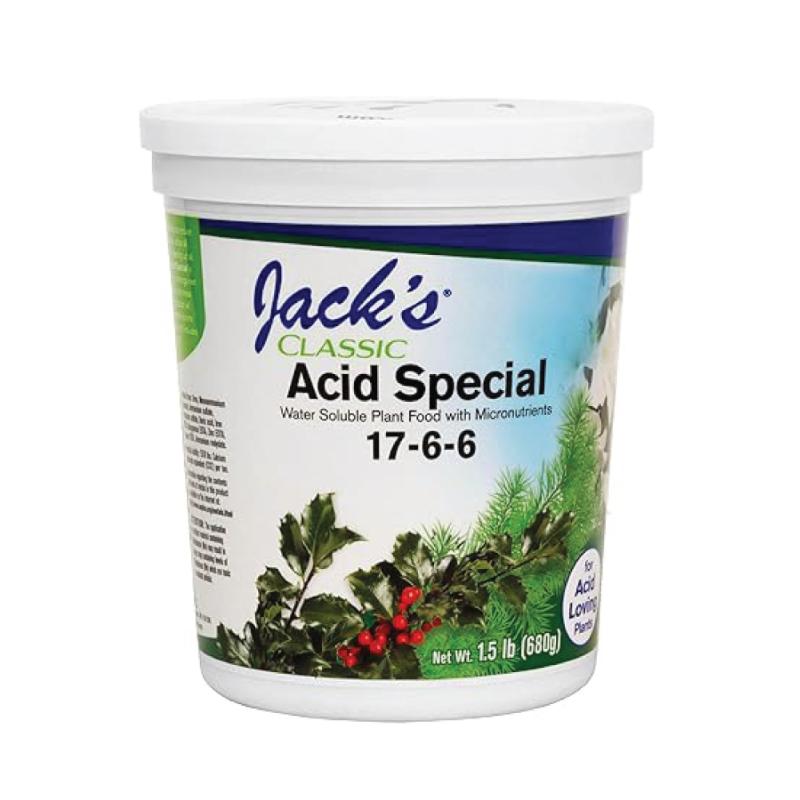 Jack's Classic Acid Special 17-6-6 is very effective in reducing the soil pH, which keeps iron and other trace elements available to the plant. In plantings next to the concrete foundations of the home, where the pH is elevated, it will keep the leaves green and healthy, promoting lush vegetative growth and better blooms.