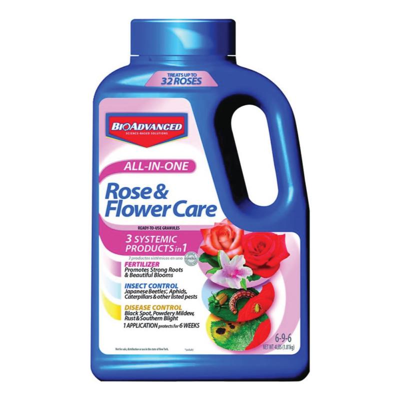 BioAdvanced All-in-One Rose and Flower Care is 3 systemic products in one! The 3-in-1 formula works as fertilizer, insect control, and disease control. The plant food fertilizer promotes strong roots and beautiful blooms for roses, hibiscuses, irises, and other flowers and shrubs. Just one application kills destructive listed insects such as adelgids, aphids, whiteflies, and more.