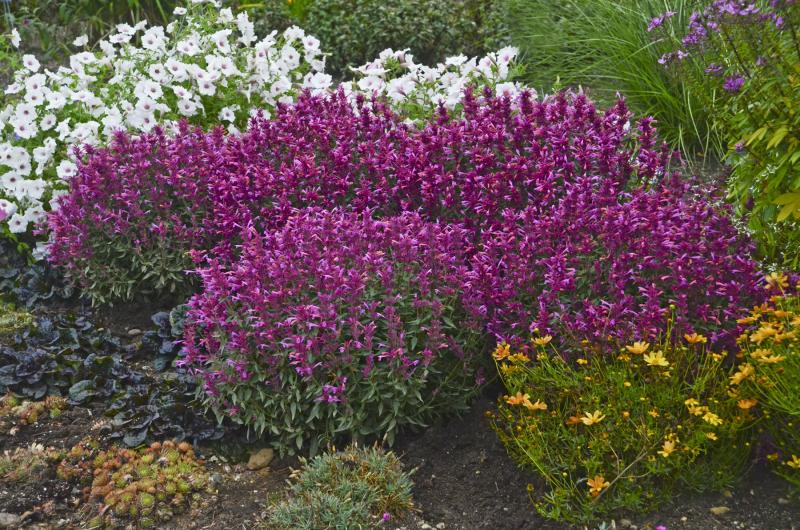 This compact plant forms a dense, rounded clump of aromatic, green leaves topped with spikes of magenta pink flowers held in deep purple calyxes over a long period.