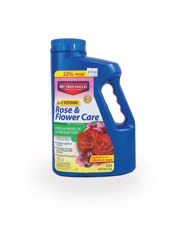 BioAdvanced 2-In-1 Systemic Rose & Flower Care feeds plus protects roses, flowers, and shrubs against listed insects in one easy step. It controls Aphids, Japanese Beetles (adult), Leafminers, Whiteflies and other listed pests.