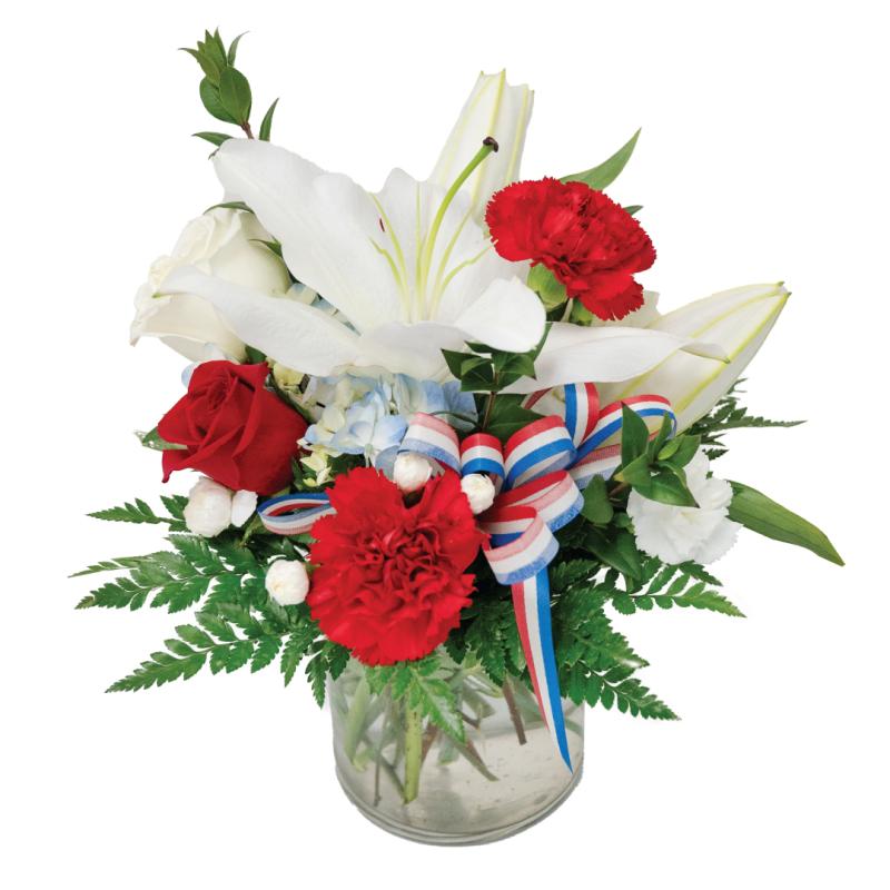 Honor their courage, remember their sacrifice. 'Hero's Tribute' is a patriotic blend of red, white and blue blooms- carnations, hydrangeas, lilies and roses - adorned with a ribbon of remembrance.