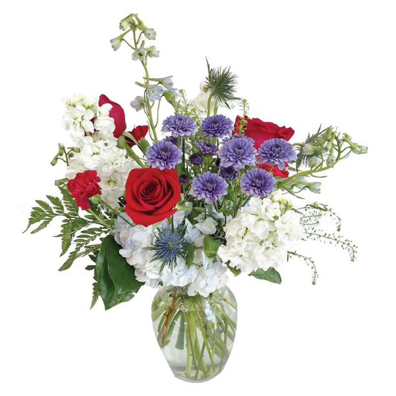 A bold and beautiful tribute in the spirit of freedom - 'Liberty' by Benken features a striking blend of roses, stock, hydrangea and mums in hues of red, white, and blue. Designed to honor those who've served and sacrificed, this patriotic arrangement is a heartfelt expression of gratitude and remembrance.