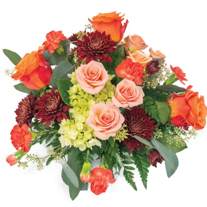 Celebrate the cozy comforts of fall with Sweater Weather — a warm and inviting centerpiece that wraps your space in autumn’s embrace. Featuring richly hued roses and spray roses, textured mums, delicate mini carnations, and lush hydrangea, this arrangement brings together all the colors of the season in one stunning display. Perfect for seasonal gatherings or simply enjoying the crisp beauty of fall at home, it’s as comforting as your favorite knit.