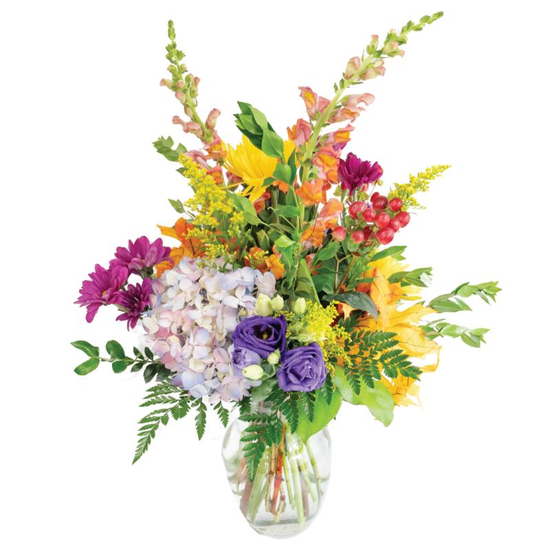 Celebrate the rich beauty of autumn with Golden Harvest — a tall and vibrant arrangement that brings the season’s splendor to life. Featuring cheerful yellow Fuji mums, bold snapdragons, classic hydrangea, daisy mums, and accents of golden solidago, this design is grounded in festive fall foliage and finished with pops of hypericum berries. Overflowing with texture, color, and height, it's the perfect statement piece for seasonal gatherings or adding warmth to any space.