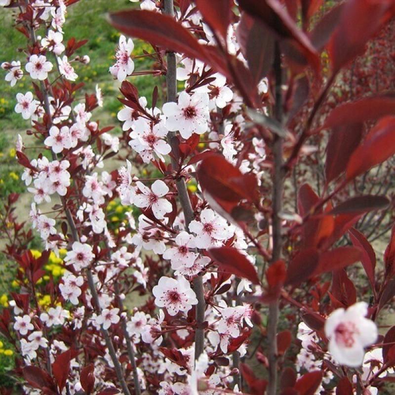 Purpleleaf Sand Cherry is a beautiful shrub with rich reddish-purple foliage. Its delicate and fragrant light pink flowers are born after the leaves have developed and its foliage emerges fully. Its small blackish-purple fruits appear in July and are enjoyed by birds during the growing season. This fast-growing, showy, medium-sized shrub will make an excellent accent in your landscape with its red tones and highlights of white flowers. The unique leaf color of the Purpleleaf Sand Cherry makes this a perfect addition to entryways or as a border, screen, or hedge. Once the plant matures, its leaves may reach 2 inches long.