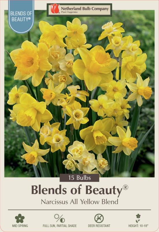 This mixture offers a wide variety of colors and shapes of yellow narcissus. Narcissus are easy to grow in well-drained soil in full sun to partial shade and are well known to be deer resistant.