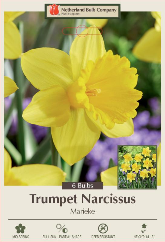 The Marieke narcissus is a large, striking trumpet daffodil known for its vivid golden-yellow perianth and a darker yellow, pronounced trumpet, blooming in mid-spring. It's highly regarded as one of the strongest yellow daffodils, featuring upright, upward-facing flowers that are excellent for mass plantings, cut arrangements, and even forcing in pots due to its sturdy stems.