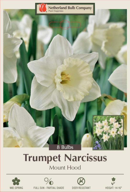 Trumpet Daffodils are known for their traditional daffodil shape; a large flower on one stem with an exceptionally long, large trumpet. Daffodils are easy to grow in well-drained soil in full sun to partial shade and are well known to be deer resistant.