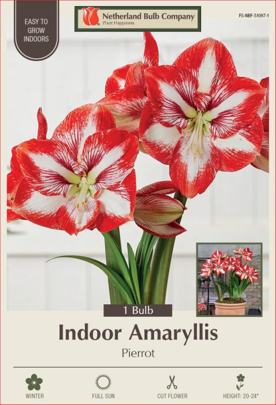 Amaryllis 'Pierrot' is a striking cultivar known for its vibrant red flowers accented with bold white stripes. It's a popular choice for holiday displays due to its festive appearance and relatively quick bloom time of 8-10 weeks after planting. The flowers are large, typically 6-8 inches across, and are borne on sturdy stalks that reach 18-22 inches tall.