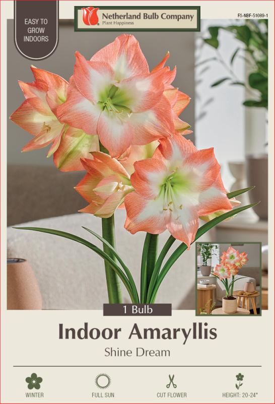 Shine Dream Amaryllis captivates with its mesmerizing 8" blooms, unfurling 8-10 weeks after planting to reveal a spectacle of iridescent white petals. These recurved beauties are elegantly outlined in coral hues, with a vibrant lime green centre adding a touch of tropical flair. Bulbs produce one or two stems, each yielding 2-5 flowers.