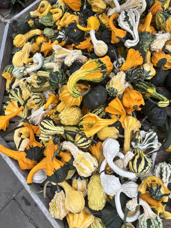 Mini funky pumpkins and gourds consist of pale yellow, white, or green pumpkins and mini gourds in an array of colors. Pictures show a variety of colors and sizes, please call or visit in store to see exact options.