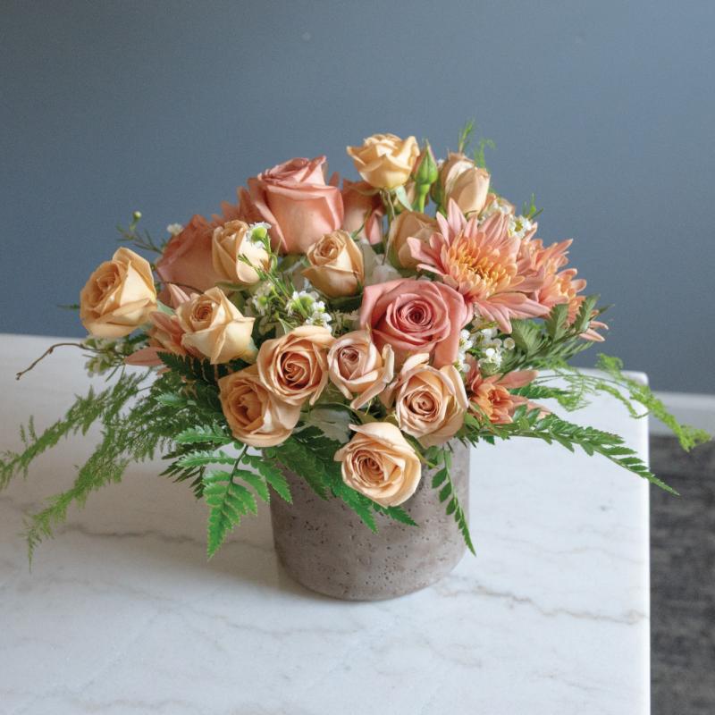 Standard Barista roses, spray roses, mums, wax flower and lush foliage come together in a timeless ceramic container for a cozy combination that is perfect for sweater weather season!