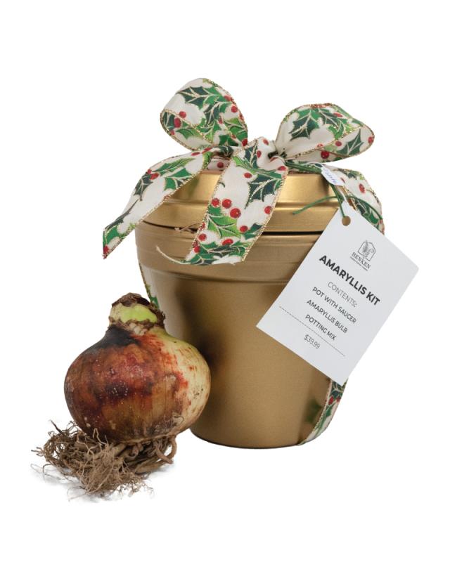 Our Amaryllis Kits are designed with hand made bows, your choice of bloom color, and instructions. This kit is the perfect gift and makes a statement in your home! The kits come in a gold, copper, white, or silver pot. Each kit is pre-made. The bow, pot, and bloom colors may not be swapped.