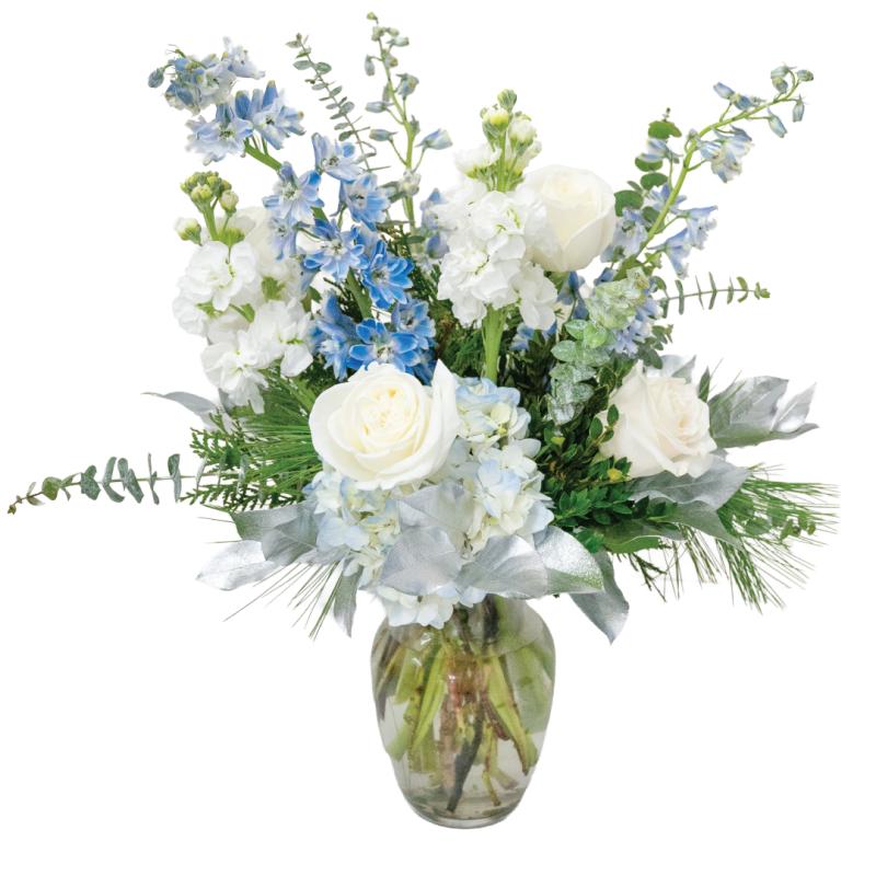 Celebrate the season with Holiday Hues, a serene and sophisticated arrangement designed to bring a touch of winter elegance to any space. Artfully arranged in a tall glass vase, this bouquet features striking blue delphinium, fragrant white stock, lush hydrangea, and crisp white roses. Seasonal boxwood and wintergreen foliage add texture and fragrance, while soft eucalyptus and shimmering silver accents complete the look with a festive, frosted finish.