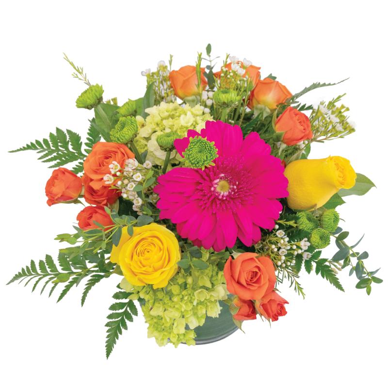 Bright, cheerful, and irresistibly charming, Cute as a Button is a playful floral arrangement designed to make anyone smile. Sweet spray roses and classic roses bring soft romance, while vibrant gerbera daisies add a pop of happy color. Button mums and delicate wax flower create a fun, textured look, perfectly complemented by the fresh greenery of eucalyptus. Mini hyacinth adds a touch of whimsy and gentle fragrance, tying the arrangement together beautifully. Full of personality and joyful detail, Cute as a Button is the perfect pick for celebrations, thank-you gifts, or just because.
