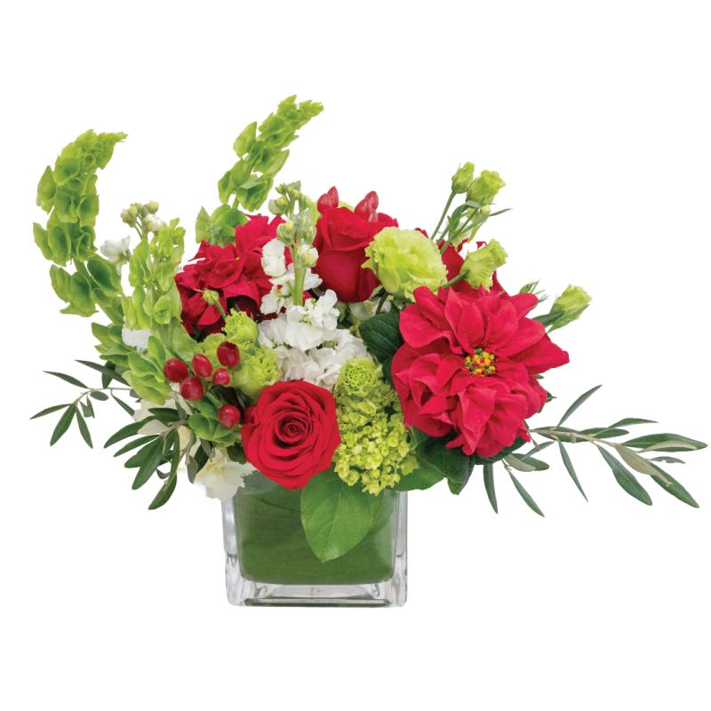 Elegant and serene, Winter Grandeur captures the timeless beauty of the season in a lush, sophisticated design. Striking poinsettias set a festive tone, paired beautifully with fragrant stock and classic roses for depth and romance. Green lisianthus and graceful bells of Ireland add height and movement, while mini hydrangea and full white hydrangea bring soft fullness and a cloud-like texture. Olive branches weave throughout the arrangement, lending a natural, refined greenery that completes the look. *Winter Grandeur* is a stunning statement piece—perfect for winter celebrations, holiday gatherings, or adding seasonal elegance to any space.