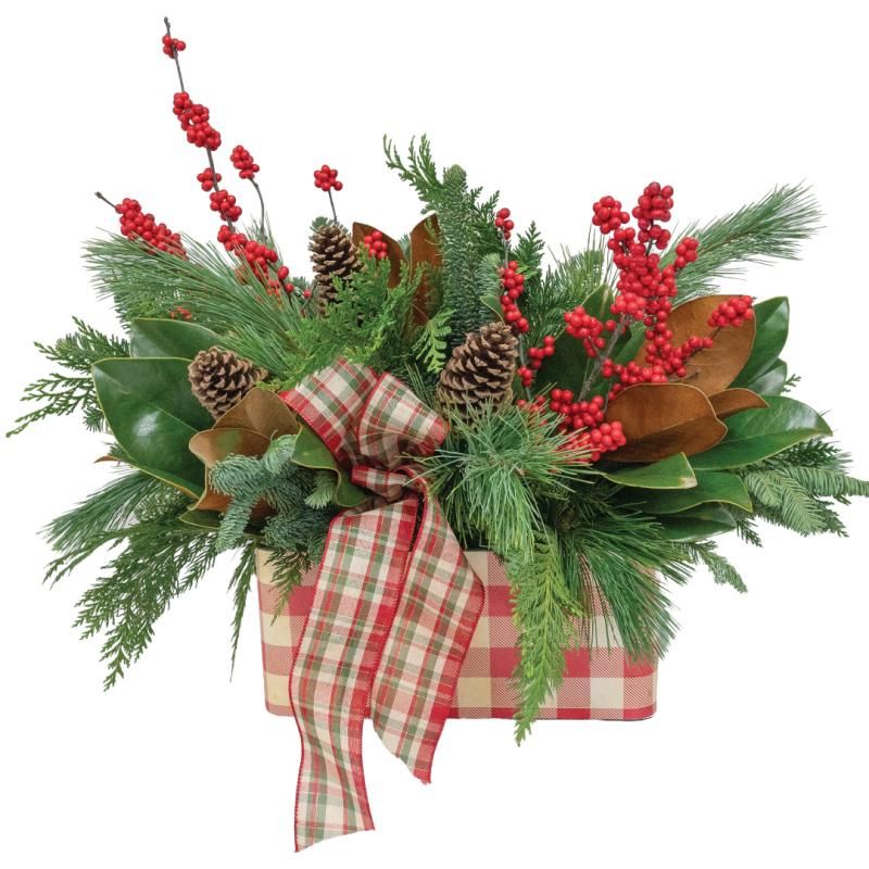 Bring the charm of a snowy forest indoors with Woodland Wonderland. This festive wintergreen arrangement features a rich mix of fragrant wintergreens accented with bright winterberries, natural pinecones, and glossy magnolia leaves. Designed in a classic rectangular plaid holiday container and finished with a cheerful festive bow, this piece adds cozy, rustic elegance to any space. Perfect for gifting or decorating your home throughout the holiday season.