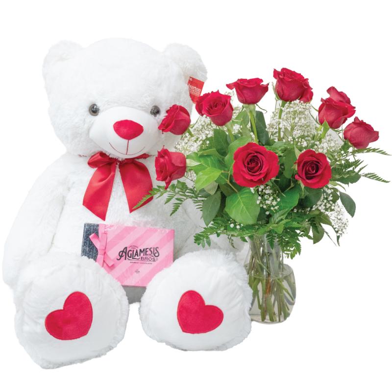 This elegant package features a luxuriously soft oversized (2 1/2' tall) teddy bear,