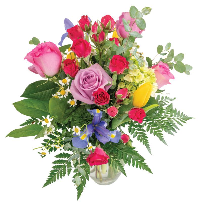 Cloud Nine is a tall, show-stopping arrangement designed to lift spirits and turn heads. A vibrant blend of purple standard roses, hot pink spray roses, striking purple iris, cheerful yellow tulips, and lush hydrangea is artfully arranged with layers of luscious foliage for added depth and movement. Bursting with color and personality, this bouquet is pure joy in floral form—perfect for celebrations, congratulations, or anytime you want to send someone straight to cloud nine.